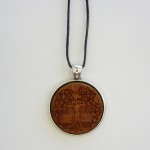 in eine Fassung aus silberfarbenem Metall montiert. Die Fassung ist recht schwer und liegt dadurch gut auf der Kleidung auf. Medallion aus Kirschbaum, Nuß- oder Ahornholz.