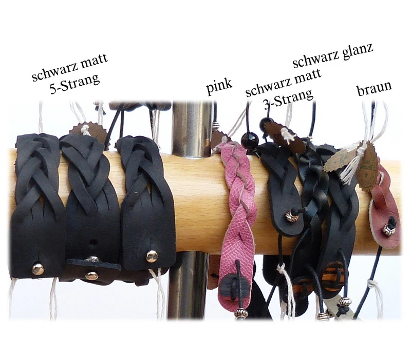 Die Fünf-Strang-Armbänder bestehen aus weichem aber robustem Leder mit einer sehr angenehmen Haptik. Zur Zeit nur in matt-schwarz lieferbar. Diese Armbänder sind ca. 3mm dick, 2,5cm breit und haben einen Kugelnietenverschluss. Die fest einstellbaren Längen (Umfang) sind 20,21,22 cm