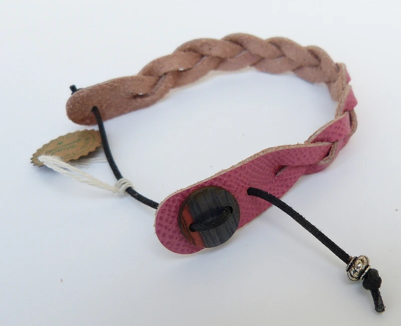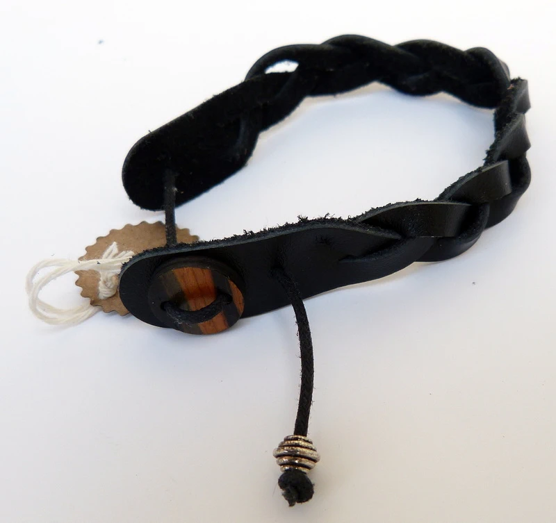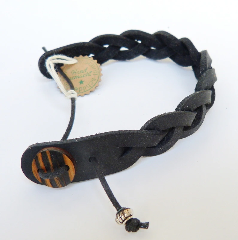 Die Drei-Strang-Armbänder werden aus verschiedenen Lederarten von weich bis fest in verschiedenen Dicken(ca.1,5-2mm) und Farben angefertigt. Die 1,5cm breiten Armbänder werden aus einem Stück geschnitten und dann verwoben. Anschließend wird der Verschluss montiert Dieser besteht aus einer selbst entworfenen Holzscheibe und ist stufenlos von ca. 16- 23cm einzustellen.