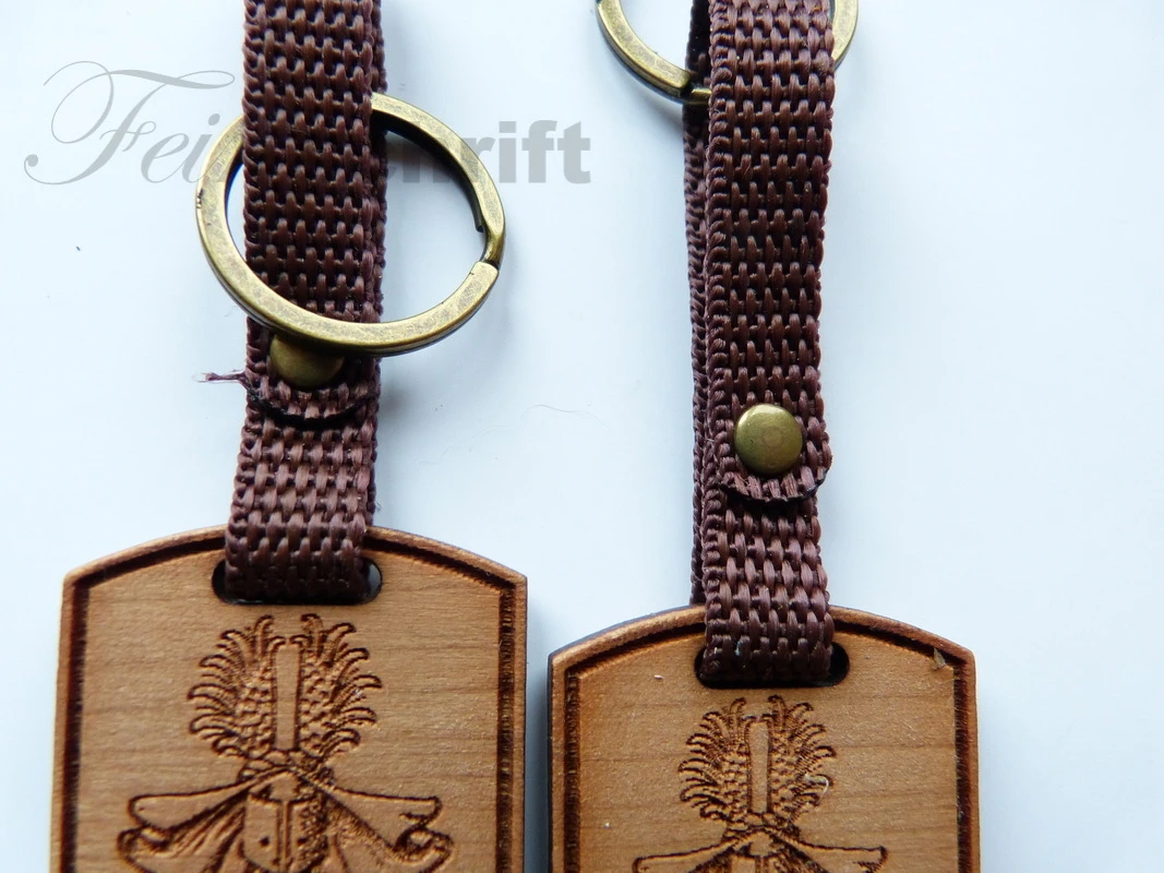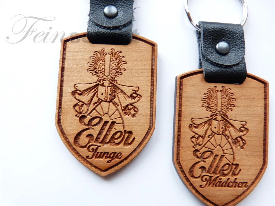 Eller Mädchen - Eller Junge aus Kirschbaumholz und Leder mit 2,5cm Schlüsselring Wappen: derer von Eller Gesamtlänge ca. 10cm, Breite ca. 4cm Auf der Rückseite kann ein Name, ein Datum oder anderer Text graviert werden.