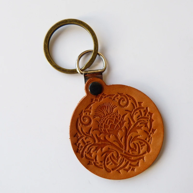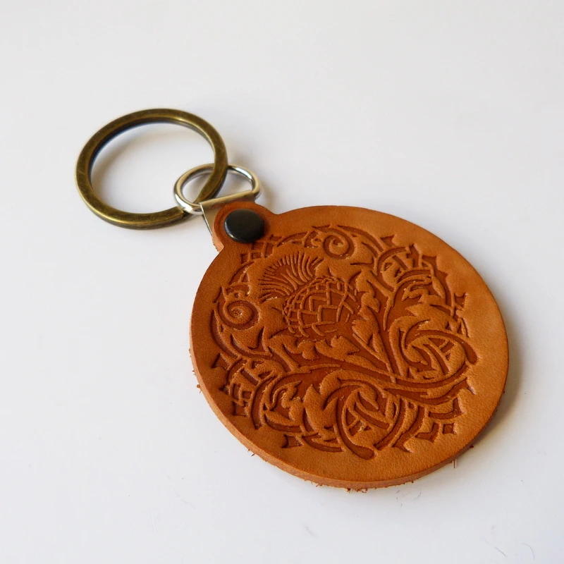Lederplatte 5cm Durchmesser mit geprägtem MotivFärbung: british tanSchlüsselring