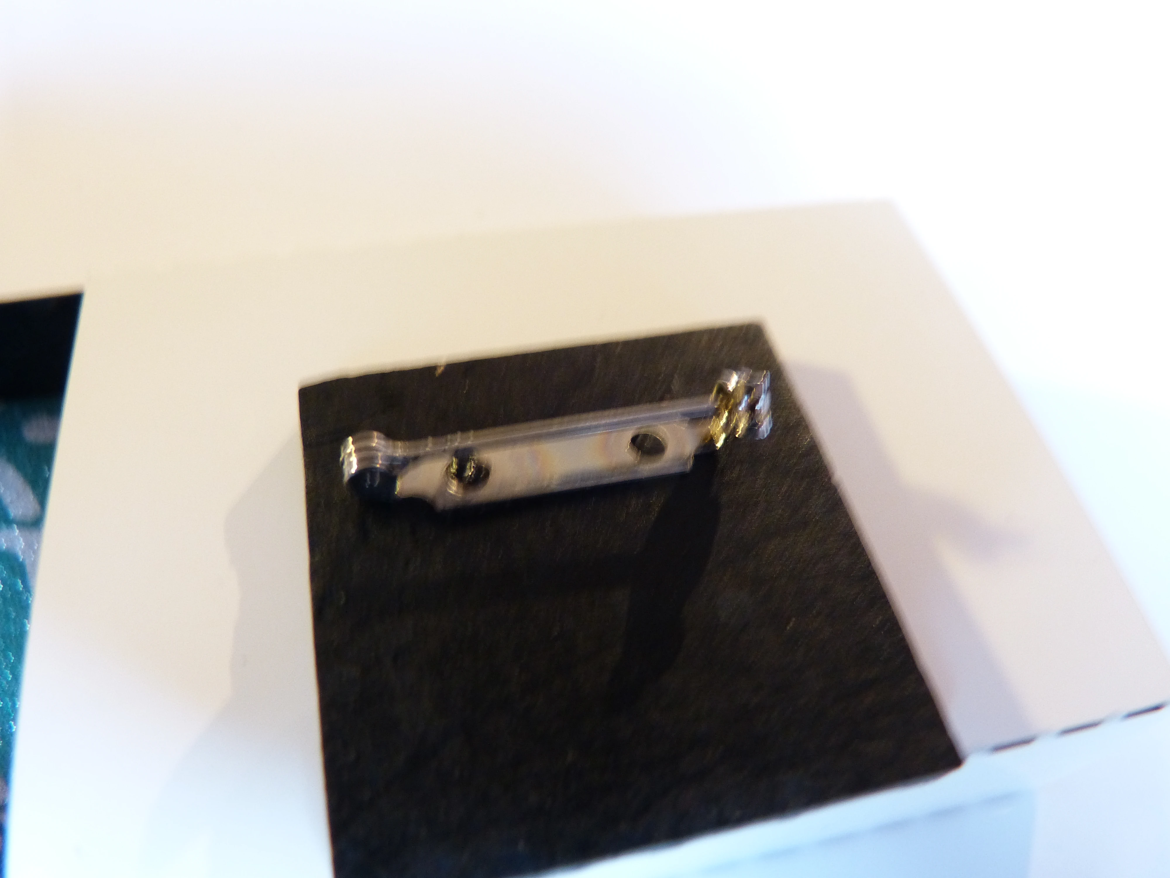 Silber geprägte Brosche mit einem kubistischen MotivDas Schmuckstück wird aus Ahornholz geschnitten und graviert. Anschließendschwearz gebeizt und dann silberfarben glänzend geprägt.Auf der Rückseite befindet sich eine Nadel zum Anstecken.