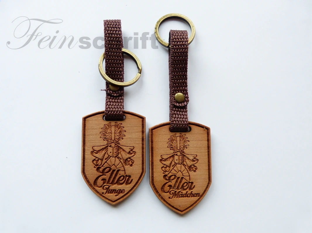 Eller Mädchen - Eller Junge aus Kirschbaumholz und Leder mit 2,5cm Schlüsselring Wappen: derer von Eller Gesamtlänge ca. 10cm, Breite ca. 4cm Auf der Rückseite kann ein Name, ein Datum oder anderer Text graviert werden.