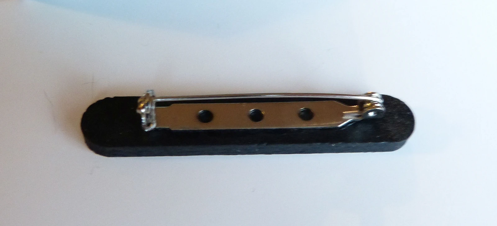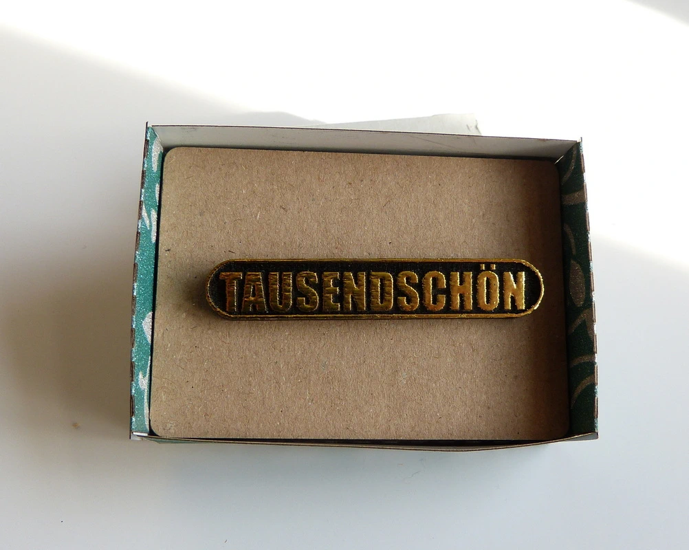 Brosche aus Holz, schwarz gebeizt und anschließend mit Goldfarbener Metallfolie glänzend geprägt. Auf der Rückseite befidet sich eine Broschennadel.