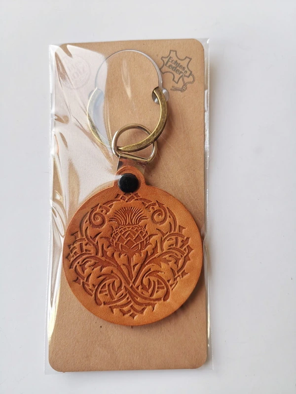 Lederplatte 5cm Durchmesser mit geprägtem MotivFärbung: british tanSchlüsselring